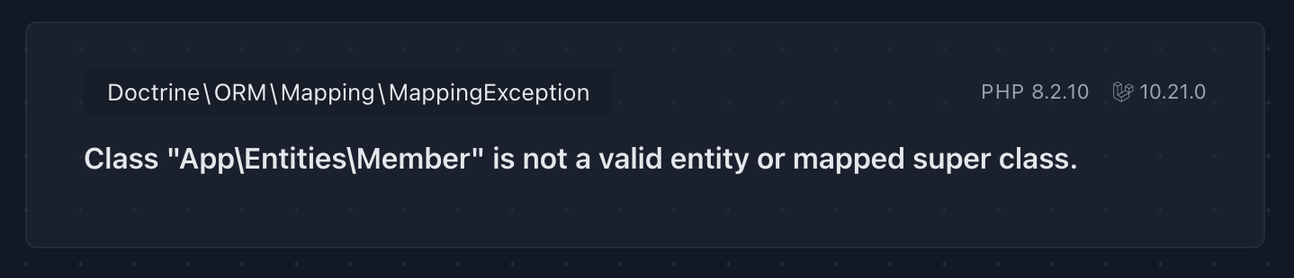 で、これもしかしたら自分の環境のせいなのかもしれませんが、laravel-doctrineを入れた場合、config/doctrine.phpのDOCTRINE_METADATAの値をattributesに変えないとClass "App\Entities\Member" is not a valid entity or mapped super class.と怒られてしまいました。