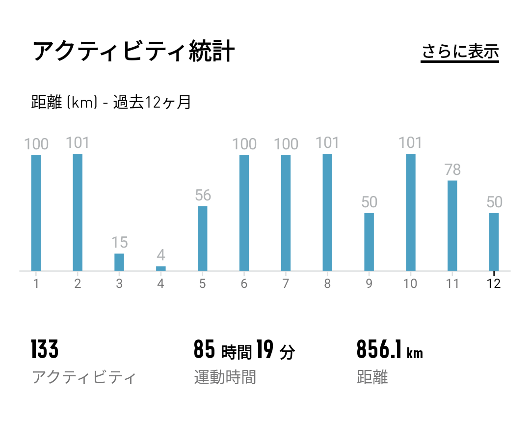 | 12月 | 50km | 10.1km(毎時) | 仕事が死ぬほど、、 |